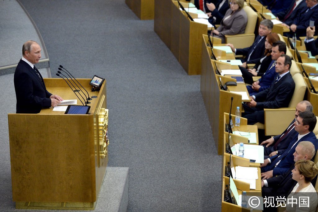 当地时间2016年10月5日,俄罗斯莫斯科,俄罗斯总统普京向选举产生的新一届国家杜马致开幕辞。