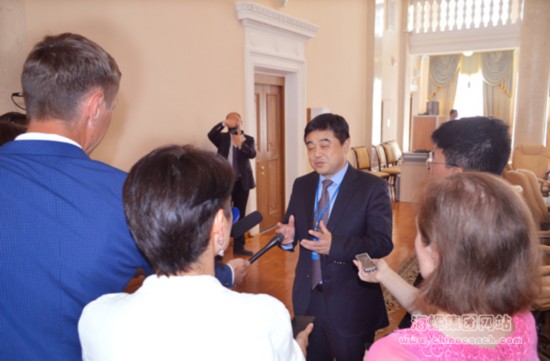 作为乌里扬诺夫斯克州目前最大的投资项目,海螺集团备受俄罗斯各地媒体关注。会议结束后,俄罗斯多家媒体采访王建超副总,王总热情地介绍了海螺集团发展情况以及乌州水泥项目基本情况。
