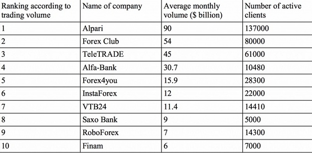 同时,2014年主导俄罗斯外汇市场的几大经纪商在去年依旧独领风骚。数据显示,艾福瑞、福瑞斯以及TeleTRADE这三家经纪商占有俄罗斯外汇客户总量的60%,且占总外汇交易量的57%。