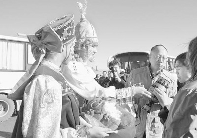 远东姑娘用面包、盐和马奶酒欢迎来自中国的游客和投资商。 |