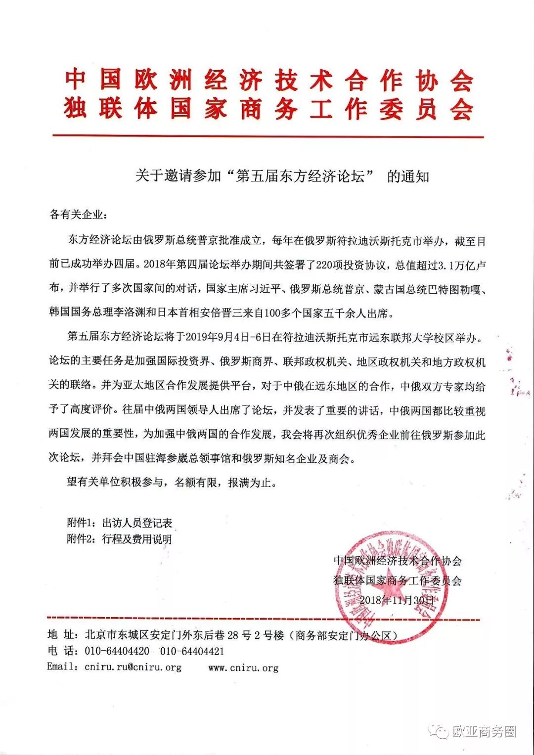 中国欧洲经济技术合作协会独联体国家商务工作委员今年依旧会组织国内实力企业代表团于2019年9月4日—6日参加本次东方经济论坛。